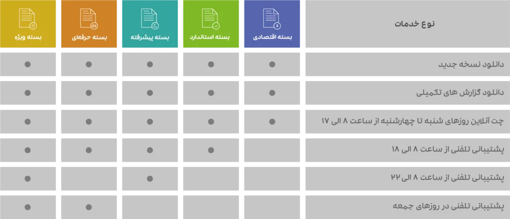 <<بسته استاندارد>> خدمات پس از فروش پس از فعالسازی نرمافزار به مدت یک سال رایگان است و پس از پایان دوره گارانتی برای تمدید پشتیبانی به نکات زیر توجه فرمایید: